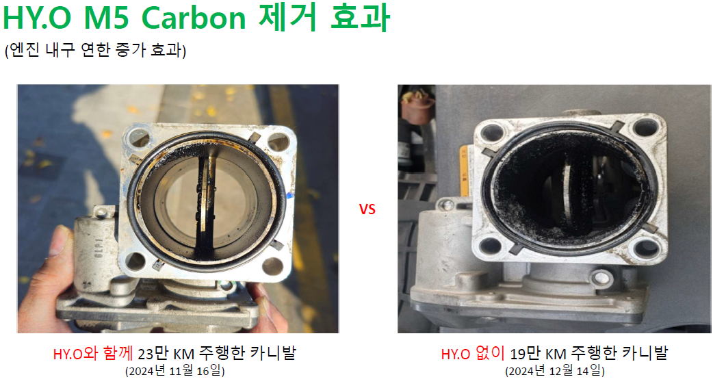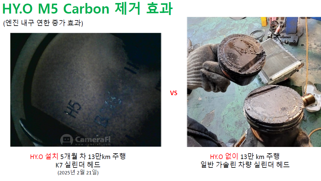 - HYO 장착 차량은 13만km 주행 후에도 실린더 헤드 내부가 깨끗하게 유지